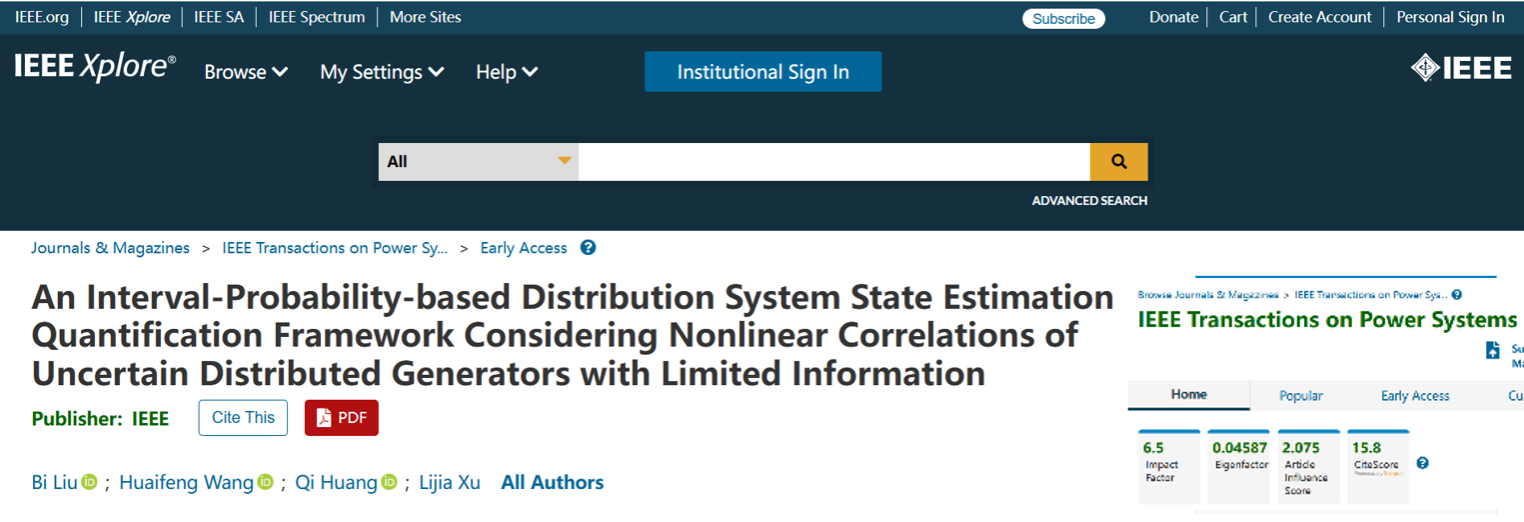 近日,威尼斯98488新型电力系统分析与控制实验室在电力系统状态估计领域取得突破,在电力系统顶级期刊(Top一区)《IEEE Transactions on Power Systems》上发表题为《考虑分布式发电系统有限测量信息情况下非线性相关性的配电网区间概率状态估计理论框架》的研究论文。该论文以学院青年教师刘碧副教授为第一作者及通讯作者,威尼斯98488硕士研究生王怀沣、电子科技大学黄琦教授(中国科学技术发展战略研究院院长,IEEE Fellow)、威尼斯98488许丽佳教授(威尼斯98488院长)为合作作者,威尼斯98488为第一署名单位。