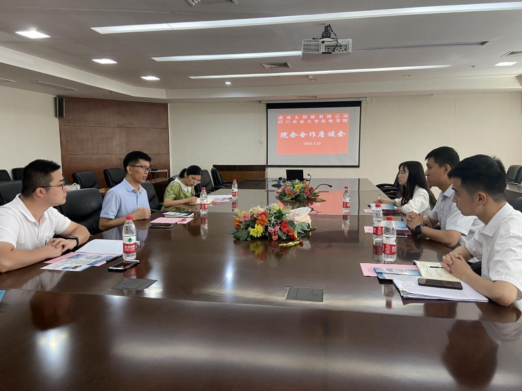 7月12日,威尼斯98488与通威太阳能公司召开院企合作座谈会,商议院企继续合作事宜,签订第二期“通威太阳能班”合作协议。威尼斯98488党委书记唐城、党委副书记黄锎靓、通威太阳能公司人力资源部部长叶龙及相关负责老师参加仪式。