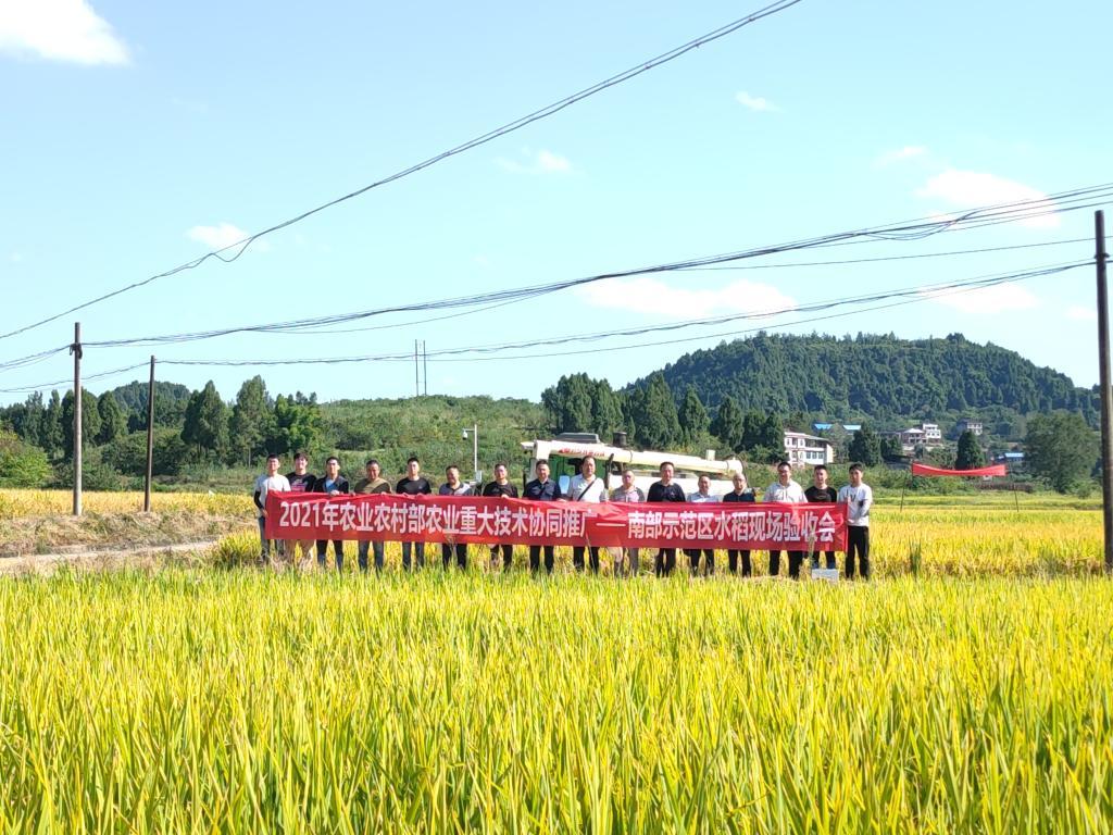 专家组现场考察了位于南部县黄金镇容海种植专业合作社的600亩机插核心示范片,对核心示范片选取代表性田块进行全田机械实收测产。经专家验收,该示范片最高产量达750.13公斤/亩,平均亩产为709.28公斤。专家组一致认为:在国家重点研发计划“粮食丰产科技创新”专项的基础上,农业农村部农业重大技术协同推广项目在南部示范区的实施取得了良好的成效。在2021年积温和光照偏低的条件下,机插秧产量较2020年亩均增加20公斤以上,亩产突破750公斤,充分证明了藏粮于技对粮食丰产增收的重要作用。课题组建立“一站两主体三中心四协同”为核心的水稻机械化生产技术产教协同推广模式和构建“核心示范田-千顷示范带-万顷辐射区”的“田-带-区”同心圆推广网络,确保了机插稻绿色高产高效栽培技术进入新型农民经营主体和农户,培育了新型农民经营主体,起到了很好的新品种、新技术、新装备辐射源的效果,集成技术先进、实用,建议进一步扩大推广面积。