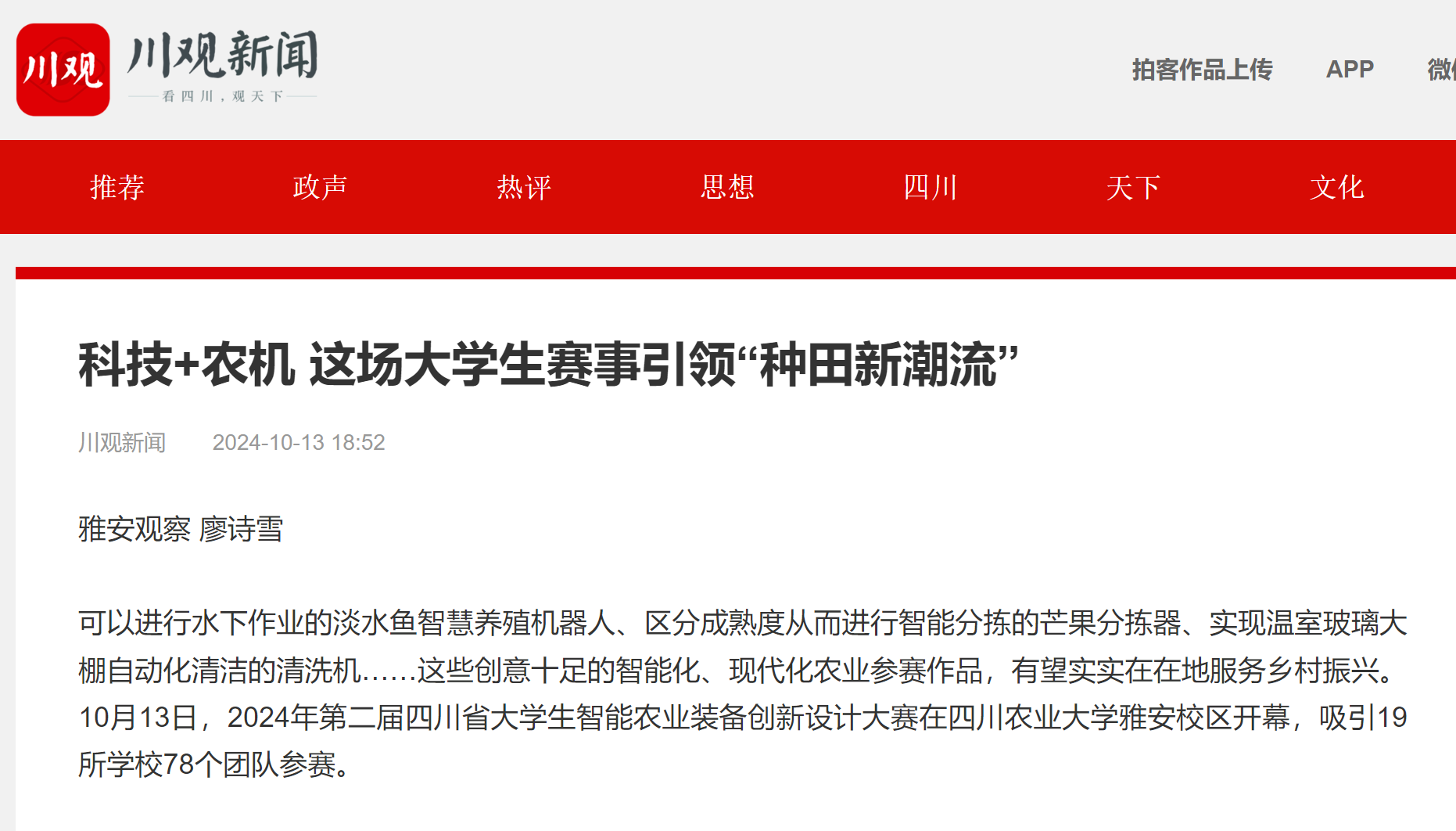 “举办四川省大学生智能农业装备创新设计大赛,旨在聚焦农业装备领域对人才的需求,激发大学生热爱农业装备科学、投身智能农业装备研发,提升大学生工程创新能力和实践应用能力,”四川省教育厅有关负责人表示,作为四川省六大优势产业之一的装备制造产业,农业装备的智慧化、精准化已成为行业发展的必然趋势,而高素质创新型的智慧农业装备人才培养则在赋能现代农业发展过程中要发挥重要的支撑作用。本次创新大赛将为学生成果展示、推介和应用提供交流平台,有利于推动农业装备创新人才协同培养,助力现代农业装备产业创新发展。