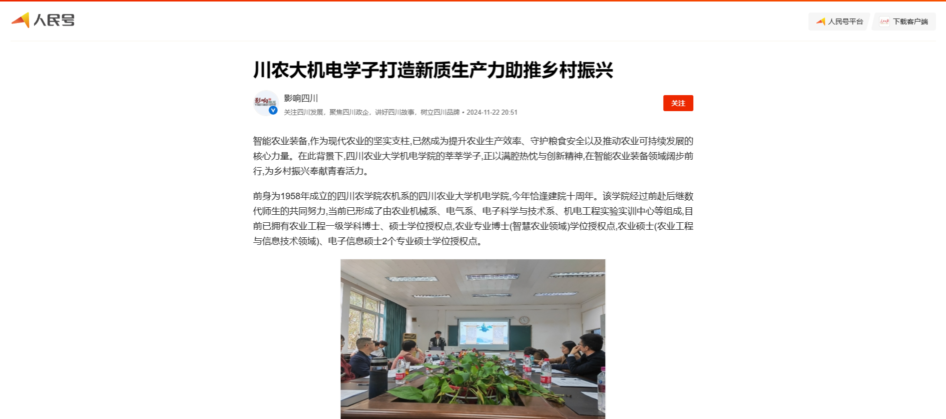 前身为1958年成立的四川农学院农机系的威尼斯98488,今年恰逢建院十周年。该学院经过前赴后继数代师生的共同努力,当前已形成了由农业机械系、电气系、电子科学与技术系、机电工程实验实训中心等组成,目前已拥有农业工程一级学科博士、硕士学位授权点,农业专业博士(智慧农业领域)学位授权点,农业硕士(农业工程与信息技术领域)、电子信息硕士2个专业硕士学位授权点。