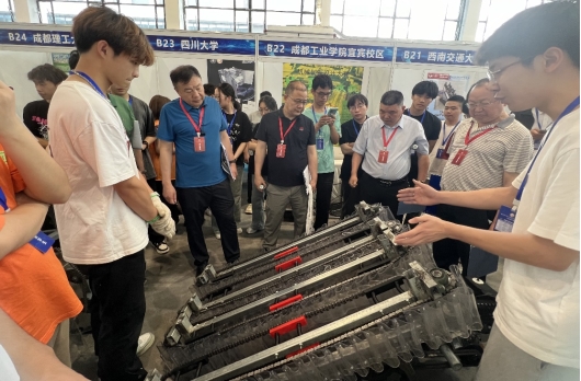 在全国大学生机械创新设计大赛中,川农大机电学子正在针对参赛作品“智能莴笋收获机”回答评委团的现场问辩