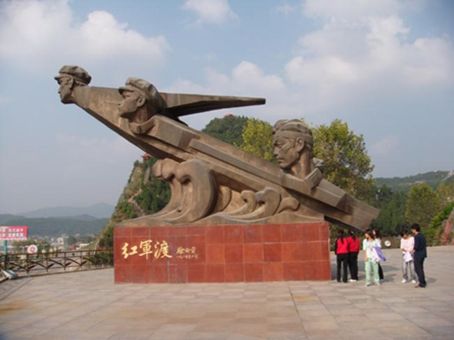 在四川省广元市苍溪县的红军渡景区,团队成员开启了一段难忘的红色之旅。在红军渡铜像前,团队成员被眼前栩栩如生的塑像深深吸引。这座由紫铜板冷锻制成、高9米长13米的铜像,生动再现了红军渡江的战斗场景。塑像底座镶嵌着徐向前元帅题写的“红军渡”三个大字,在阳光照耀下熠熠生辉。底座上,三名红军战士和两名赤卫队员的半身塑像神情肃穆,怒目圆睁,仿佛将大家带回到当年波涛汹涌、杀声震天的渡江战场。这些雕像不仅还原了历史的瞬间,更传递出一种不屈不挠、英勇向前的革命精神。