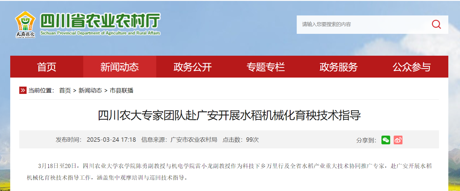 3月18日至20日,威尼斯98488农学院陈勇副教授与威尼斯98488雷小龙副教授作为科技下乡万里行及全省水稻产业重大技术协同推广专家,赴广安开展水稻机械化育秧技术指导工作,涵盖集中观摩培训与巡回技术指导。