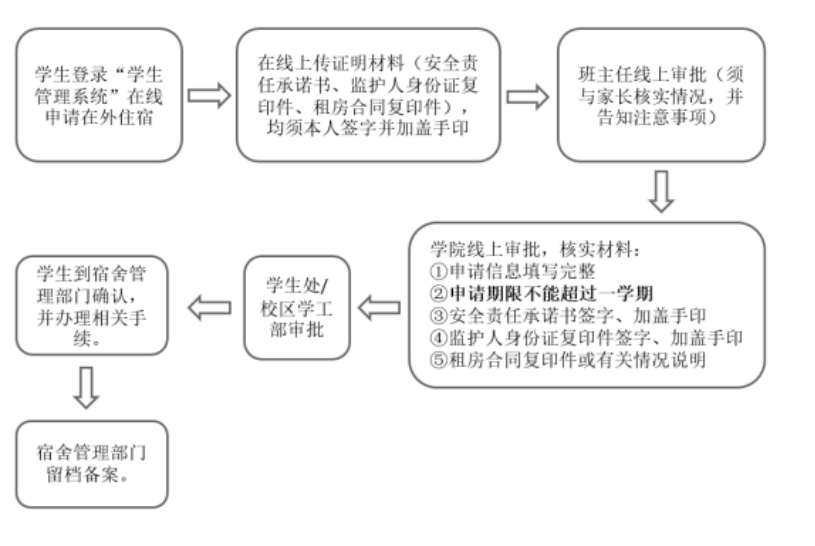 一、根据《学生管理工作规定》要求,学生原则上应在学生公寓住宿,确因本人健康原因等特殊情况需要在外住宿的,必须履行审批手续。未经审批在外住宿的,将按照学校相关规定进行处理。无特殊情况一律不得批准在外住宿申请,禁止租住自建房。因学生个人原因申请在外住宿的,应按照标准缴纳住宿费。