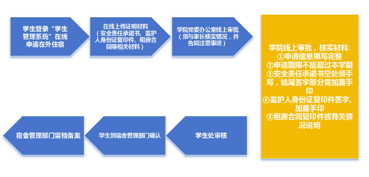 登录“学生管理系统”提出申请,上传证明材料,经学院审批再经学生处终审后方可在外住宿,具体流程如下图: