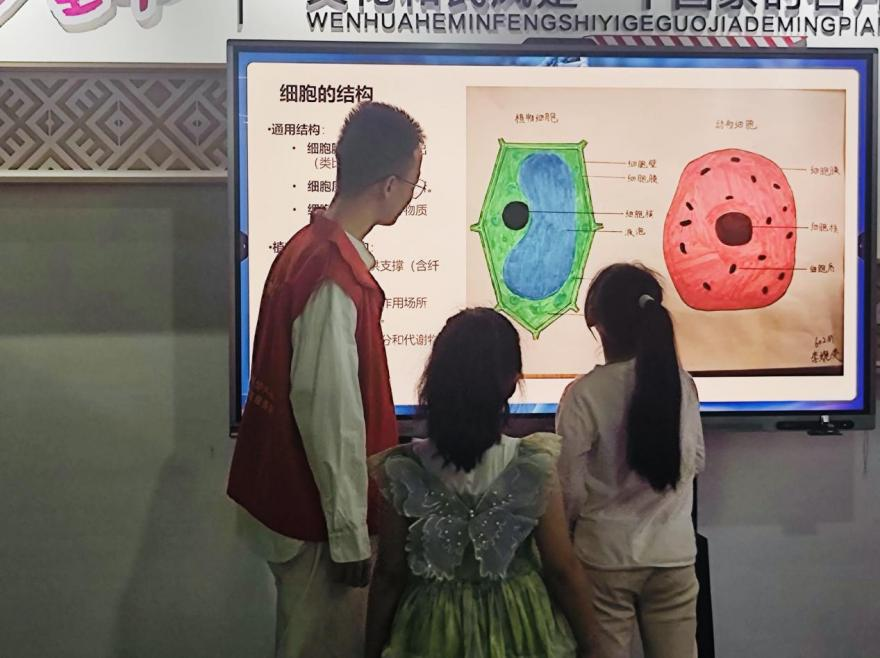 在“生物学的应用”环节,志愿者向孩子们讲述了陈薇院士团队研发新冠疫苗的“中国速度”、袁隆平院士培育杂交水稻的“稻田奇迹”,以及众多科学家在生物学领域的奋斗故事。孩子们深受鼓舞,纷纷表示:“长大后也想成为这样的科学家!”