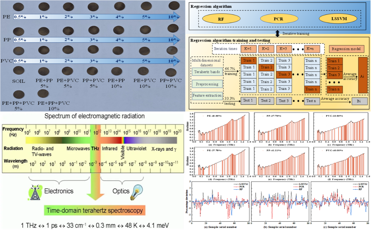 土壤微塑料样本图、机器学习算法结构图、太赫兹波长示意图、特征提取示意图、回归模型结果示意图